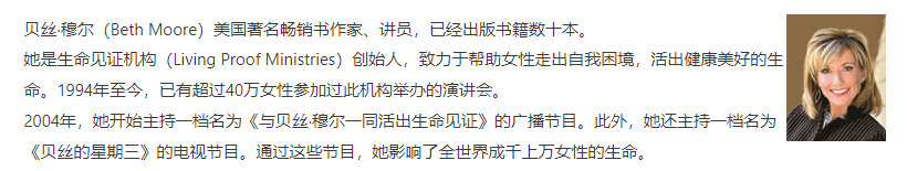 贝丝.摩尔(Beth Moore,或译为贝丝.穆尔)号称是美国福音派里最著名的女性圣经教师,著有多本畅销书。下面是对她的简介截图: