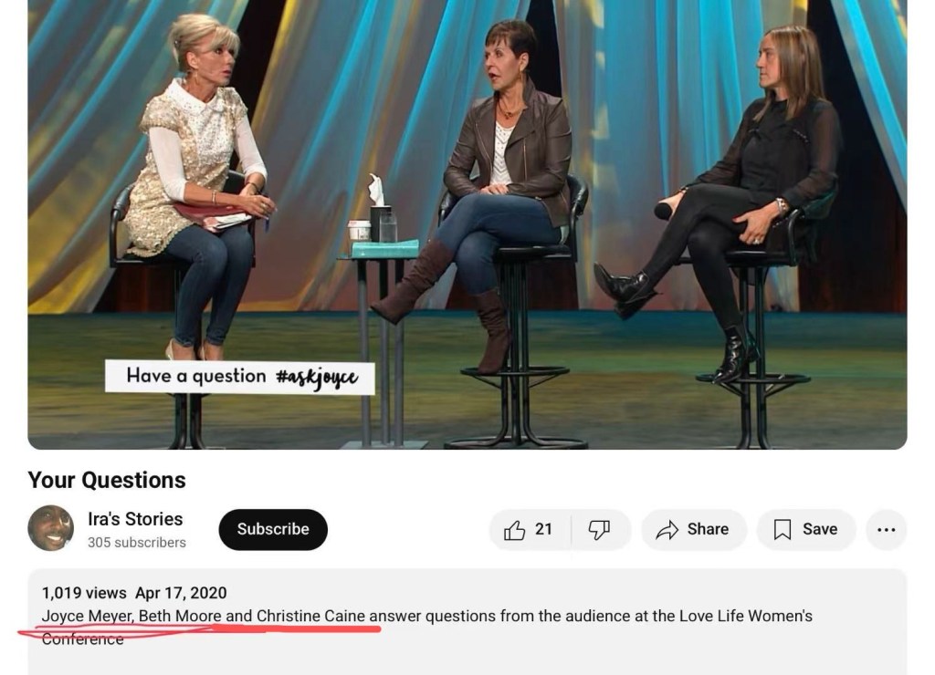 2。贝丝·摩尔推崇像约尔·奥斯汀(Joel Osteen)、克里斯汀·凯恩(Christine Caine)和乔伊斯·迈尔(Joyce Meyer)这样的假教师。