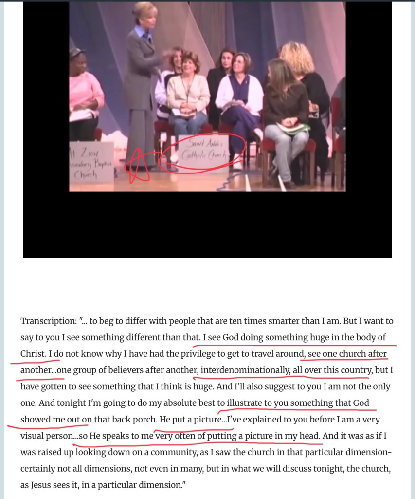 下图就是截自贝丝的一个节目视频,站着讲话的就是贝丝。在这个节目里,她声称神给她看到一个特别的异象,她看到属于基督的各种不同宗派,有路德宗,浸信会,还有天主教,等等。 这说明,她不认为异端天主教是异端,而是属于基督的教会,这是严重的错误!而且神也不可能给她这样的异象,她的这个异象,要么是她自己谎编的,要么是出自撒但,可见她确实是极其危险的人士!