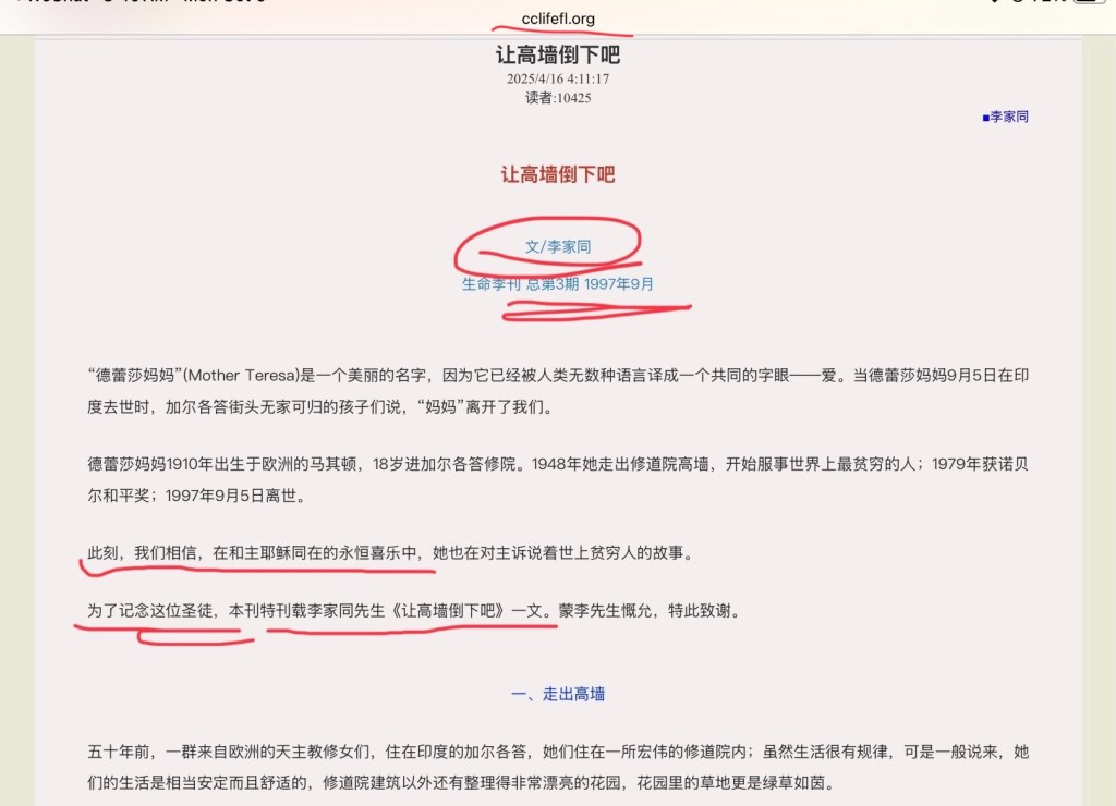 1997年9月5日德蕾莎修女(Mother Teresa)去世,生命季刊就在1997年9月发行的季刊上转发了台湾天主教徒李家同赞誉德蕾莎修女的文章,题为《让高墙倒下吧》,见下面截图: