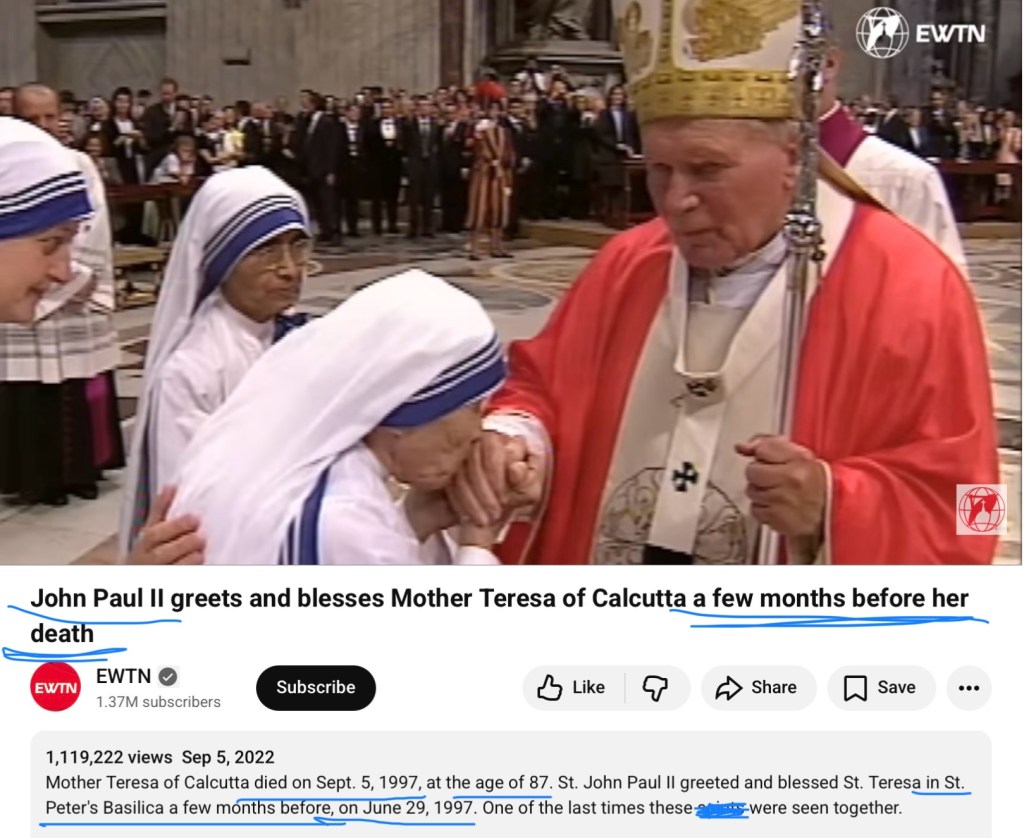 1997年6月29日,也就是德蕾莎修女(Mother Teresa)死前2个多月,她在梵蒂冈得到了当时的教宗保罗二世(John Paul II) 的接见。下图是他们当时见面的报道视频截图,亲吻教宗手的就是德蕾莎修女: