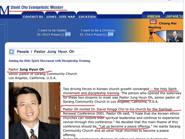 而吴正贤(Jung Hyun Oh)早在2001年就与异端成功神学大师赵镛基(David Yongqi Cho)彼此接纳联合了。下面是赵镛基的事工网站上对他们联合的报道《Joining the Holy Spirit Movement with Discipleship Training》(圣灵运动和门训联合)截图,里面说到2001年,吴正贤因为圣灵更新会议而请赵镛基到他的教会。