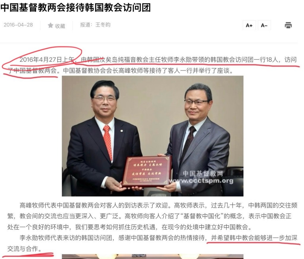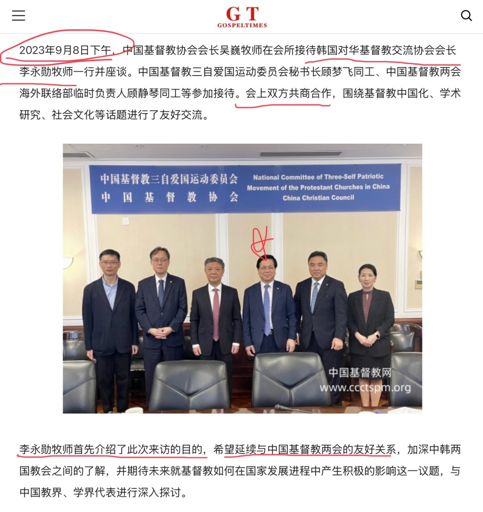 李永勋还是韩国对华基督教交流协会会长,曾多次参访两会和三自。看下面报道截图: