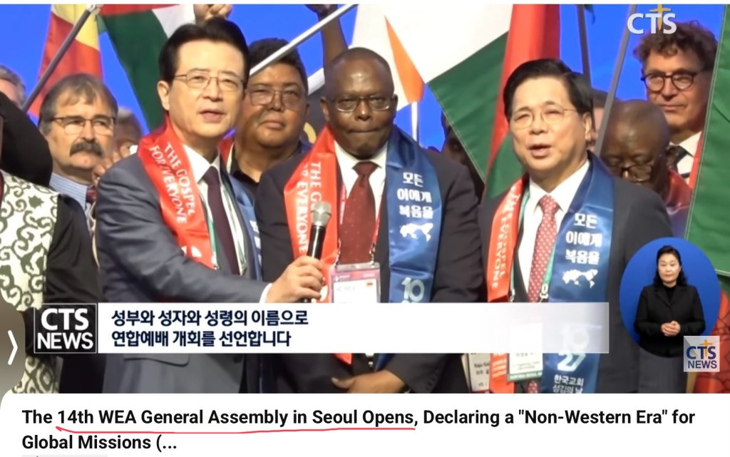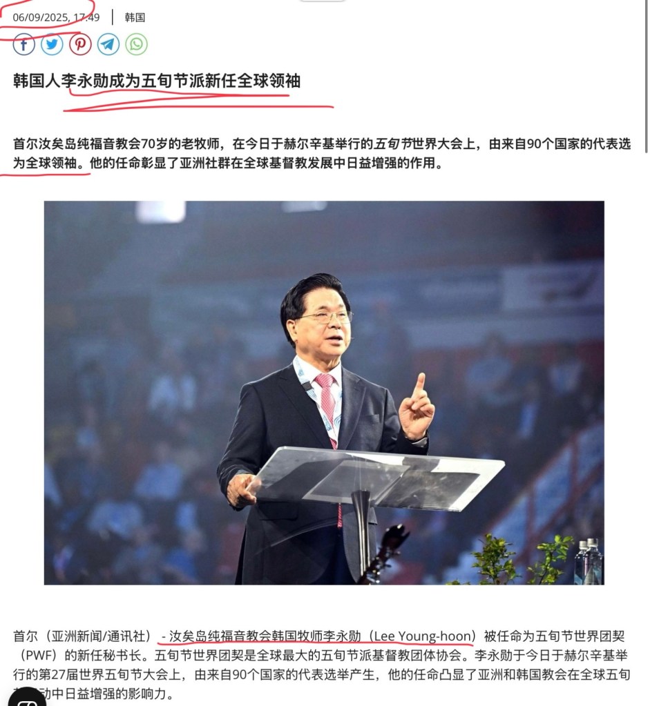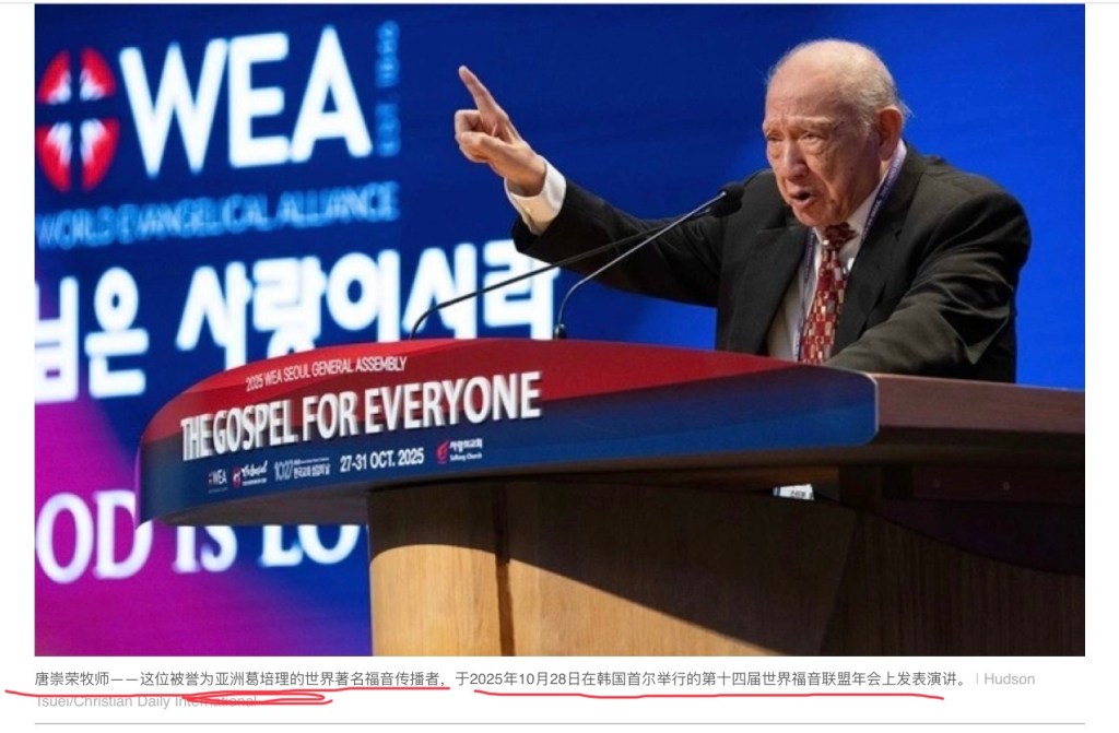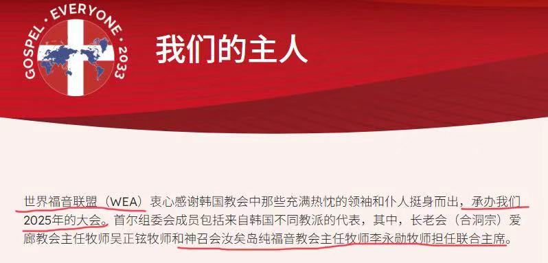 据报道,世界福音联盟(WEA)2025年10月27日 – 31日 在韩国的首尔举办大会,主题为《The Gospel For Everyone By 2033》(2033年福音到万邦),有来自124个国家的福音派领袖,约900名国际代表参与。此次大会的主办方之一是韩国汝矣岛纯福音教会主任牧师李永勋牧师( Rev. Young-hoon Lee)和爱的教会吴正贤(Oh Jung-hyun)。看下面世界福音联盟(WEA)有关主办方的介绍的截图: