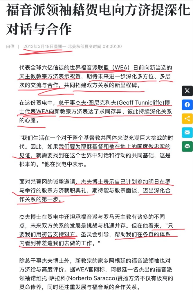 2013年方济各当选为天主教教宗时,世界福音联盟(WEA)就表示祝贺,并要与他发展合作关系,而且还把天主教视为是在基督教共同体里。看下面2013年3月的报道截图: