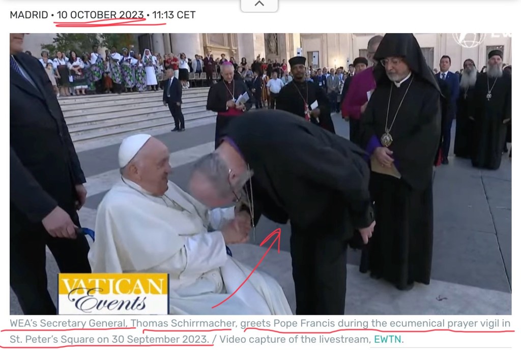2023年9月,世界福音联盟秘书长托马斯·席尔马赫(Thomas Schirrmacher)参加梵蒂冈普世教会祷告守夜活动,据报与会者愿意“重申我们共同迈向合一的愿望和承诺。” 报道截图如下: