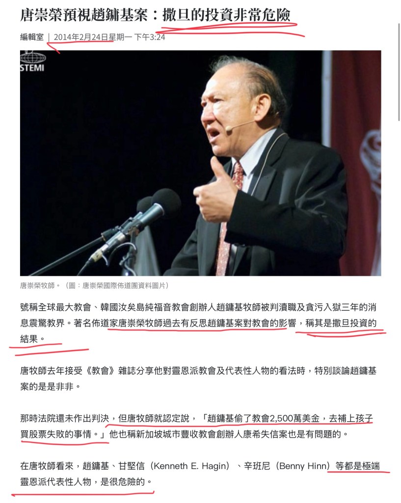 唐崇荣数年前也批判过赵镛基,他说那是撒但的投资,不是圣灵的工作,见下面截图: