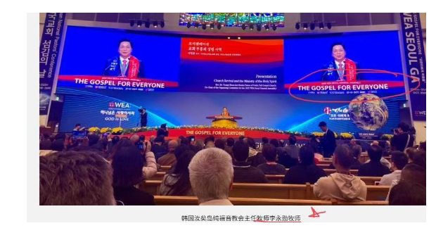 而李永勋牧师( Rev. Young-hoon Lee)正是赵镛基的接班人。下面就是李永勋在此次大会上讲话时的画面: