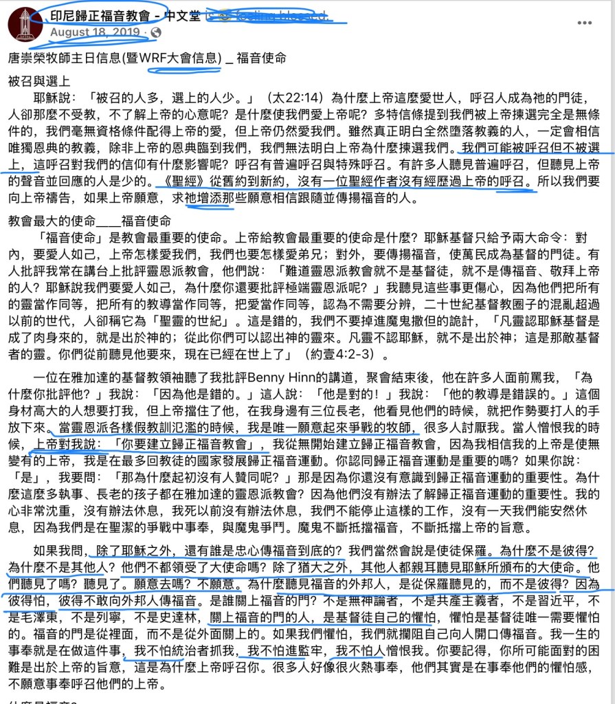 顺带指出,在唐崇荣的这次讲道里,他还说,“当灵恩派各样假教训氾滥的时候,我是唯一愿意起来争战的牧师,很多人讨厌我。当人憎恨我的时候,上帝对我说:「你要建立归正福音教会」,我从无开始建立归正福音教会,。。。”