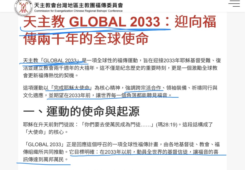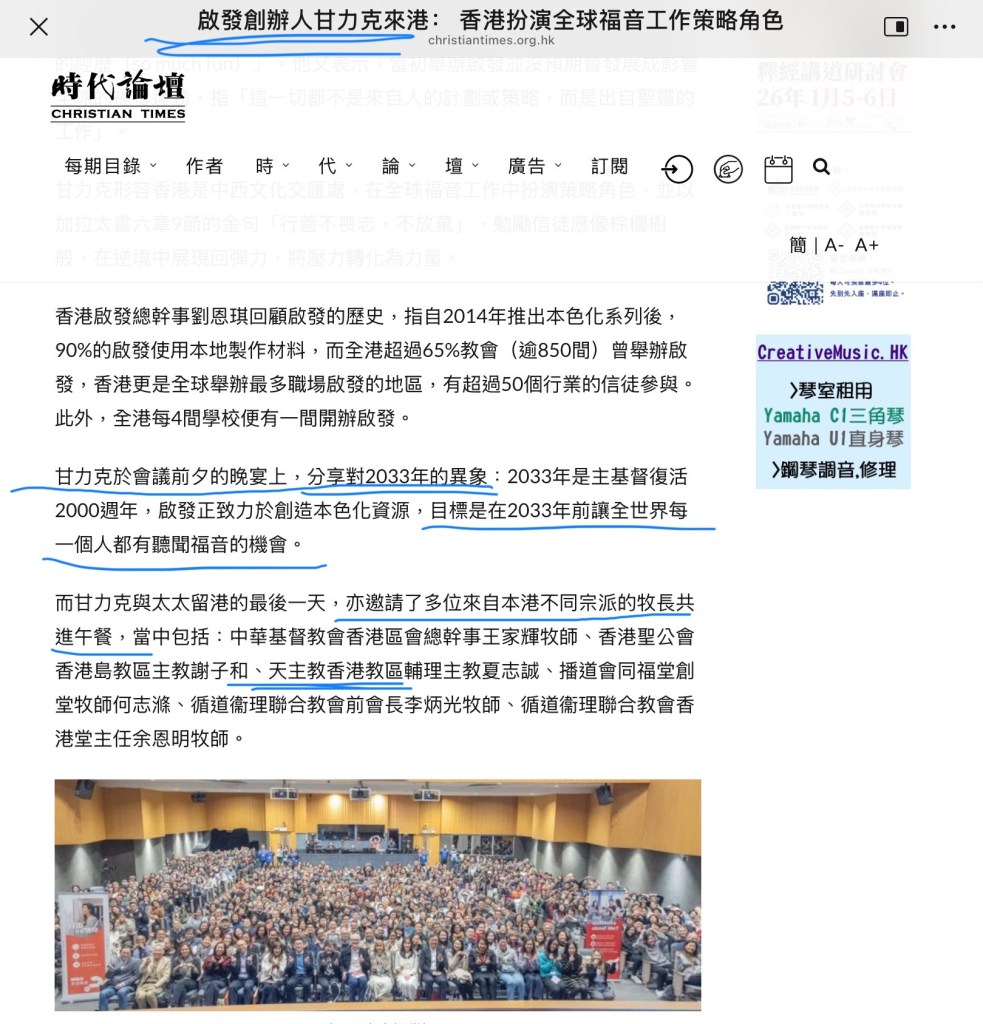 2025年2月,启发课程的创办人甘力克到香港,也在喊2033年的口号,并邀请不同的宗派的人士在一起,也有天主教的人士。看下面报道截图: