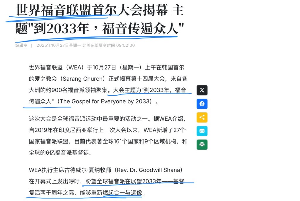 最后是关于今年10月底召开的世界福音联盟(WEA)大会,大会的主题也是这个2033年的口号。可见这个口号已经越来越流行,不只是天主教喊,灵恩派也跟着喊,连福音派也加入了。在这个所谓的“到2033年,完成大使命” 幌子下,天主教、灵恩派、福音派都喊出了如此一致的口号。看下面一些有关2025年10月 WEA 会议的报道截图,唐崇荣也是被邀请的讲员之一,所以他也去参加了这个大会。