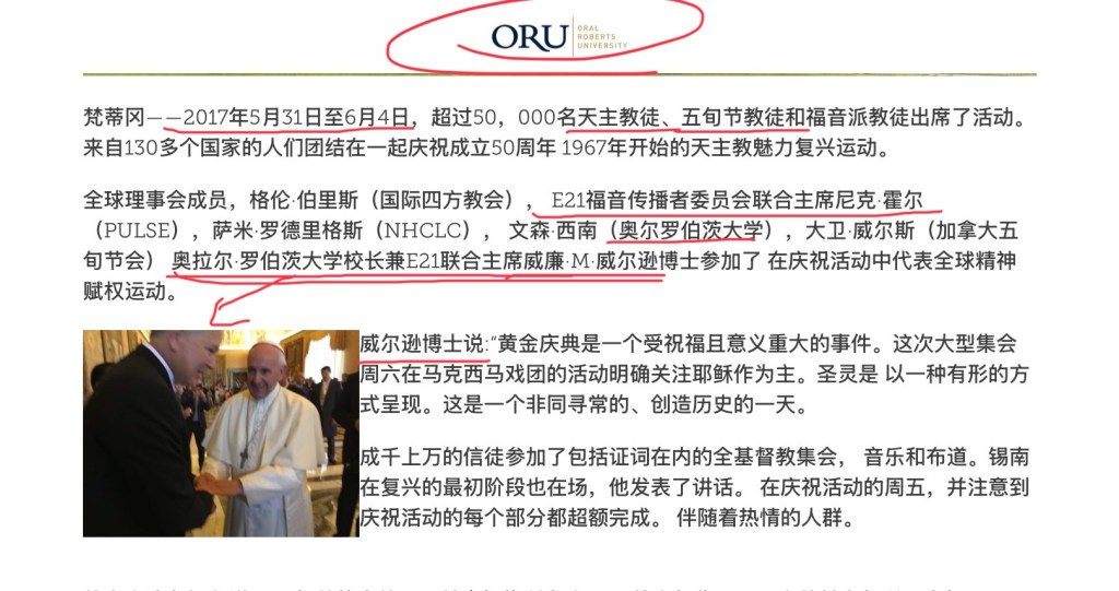 下图是2017年 Bill Wilson(威尔逊)参加了庆祝天主教灵恩运动50周年的活动,并与教宗方济各握手的报道截图: