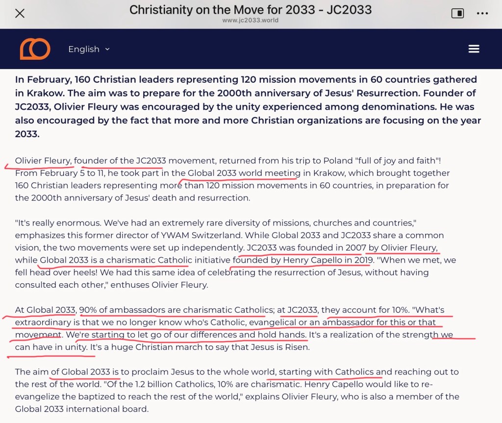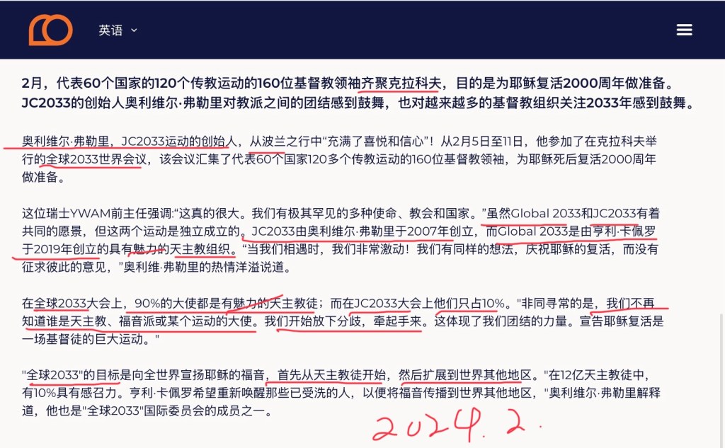 2024年2月 JC2033 与 Global 2033( 全球2033)在波兰举办会议,也是在讨论2033年这个口号。Global2033 是2019年创办的一个组织,成员90% 是灵恩派天主教徒(Charismatic Catholics), 实际上,就是个天主教的组织。而 JC2033 声称都搞不清成员里谁是天主教、福音派,或别的,反正都放下分歧联合起来。所以,JC2033 也就是一个大混杂的组织。看下面对2024年2月这个聚会和这两个组织的介绍截图,由于中文是用自动翻译产生的,其中把灵恩派天主教徒(Charismatic Catholic)自动翻成“有魅力的天主教徒”,所以就把英文原文也附上。