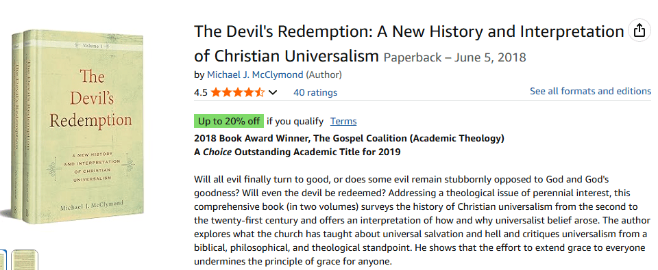 译注:2018年,迈克尔·麦克莱蒙(Michael McClymond)出版了一本批判普救论的书籍,书名为《The Devil’s Redemption: A New History and Interpretation of Christian Universalism 》(鬼魔的救赎:基督教普救论的新历史和诠释),书介截图如下: