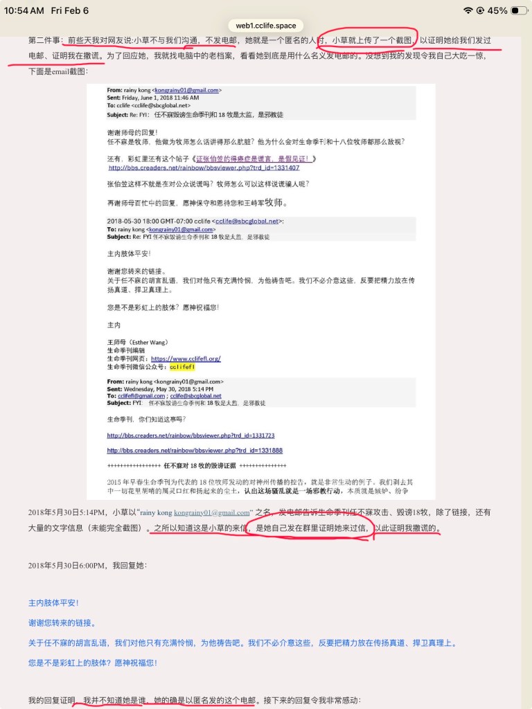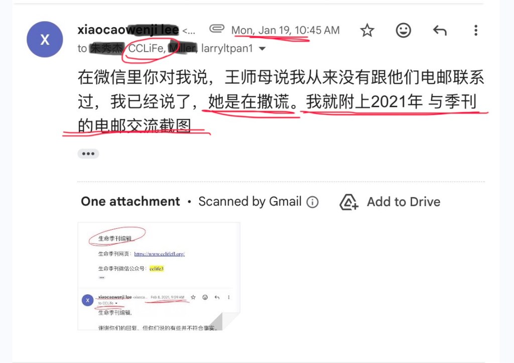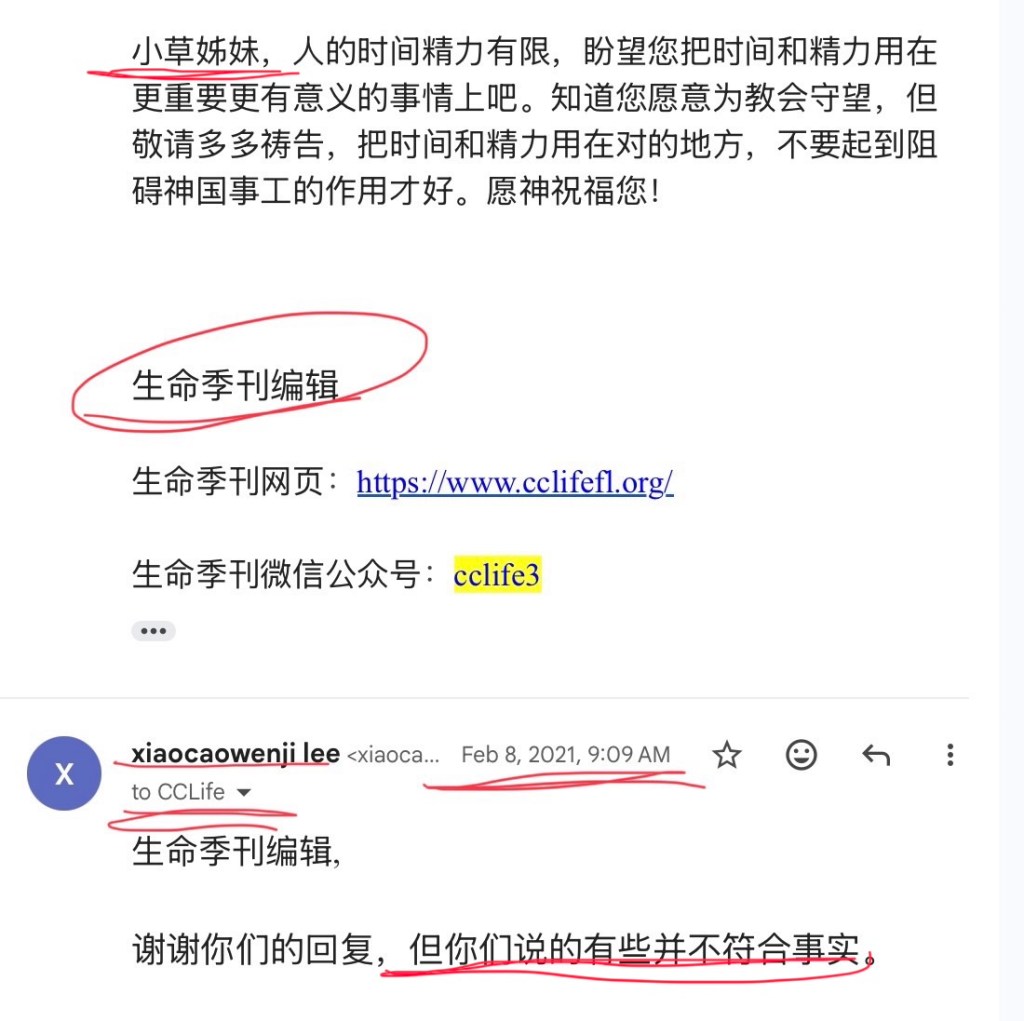 屈儆聆在我背后对朱弟兄说,我从来没有跟季刊电邮联系过,还强调从来没有。当时我就指出她在撒谎,并出示了一张我在2021年给季刊的电邮截图。后来在我们几个人与季刊的电邮联系里,朱弟兄说屈儆聆让我再出示我给季刊的电邮截图,我就把下面这张2021年给季刊的电邮截图发到电邮群里,季刊电邮群里有季刊(cclife),还有陈鸽,朱弟兄,Caspar弟兄,他们都是证人。下面就是我发的电邮截图: