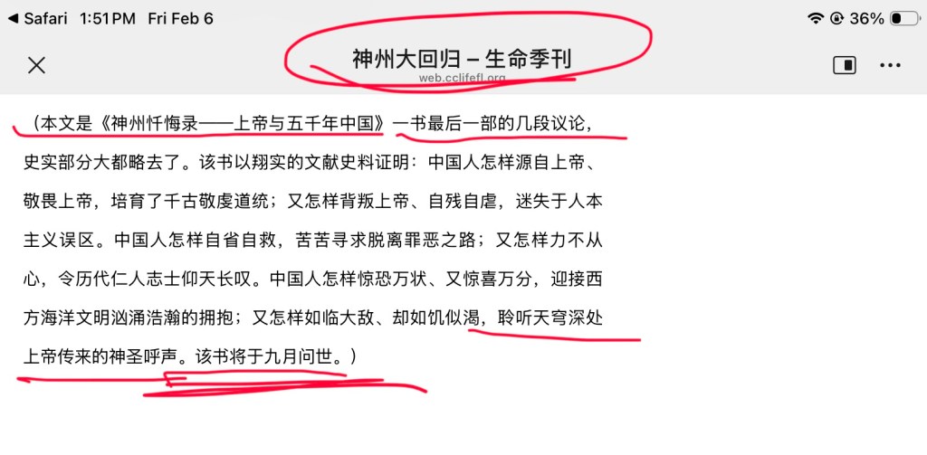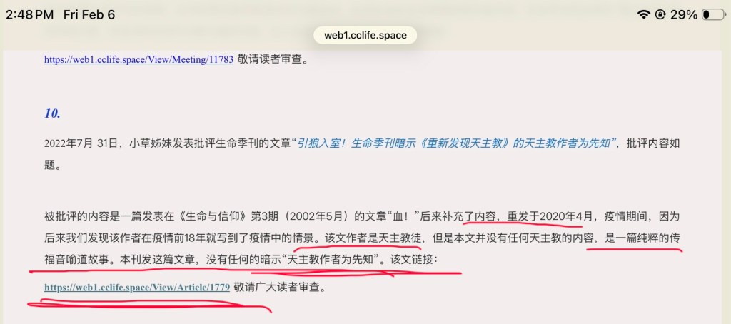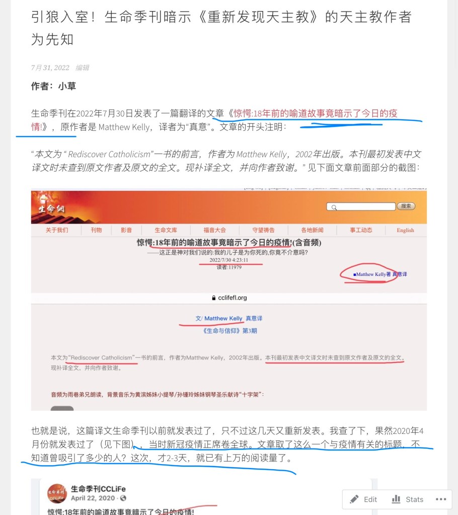 季刊否认他们发表的那篇译自天主教徒的文章有暗示天主教作者是先知,但我所指的文章并不是季刊回应里给出的那篇早期发表的,而是指季刊2022年7月发表的《惊愕:18年前的喻道故事竟暗示了今日的疫情!》。截图如下: