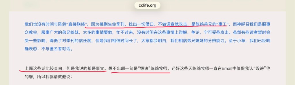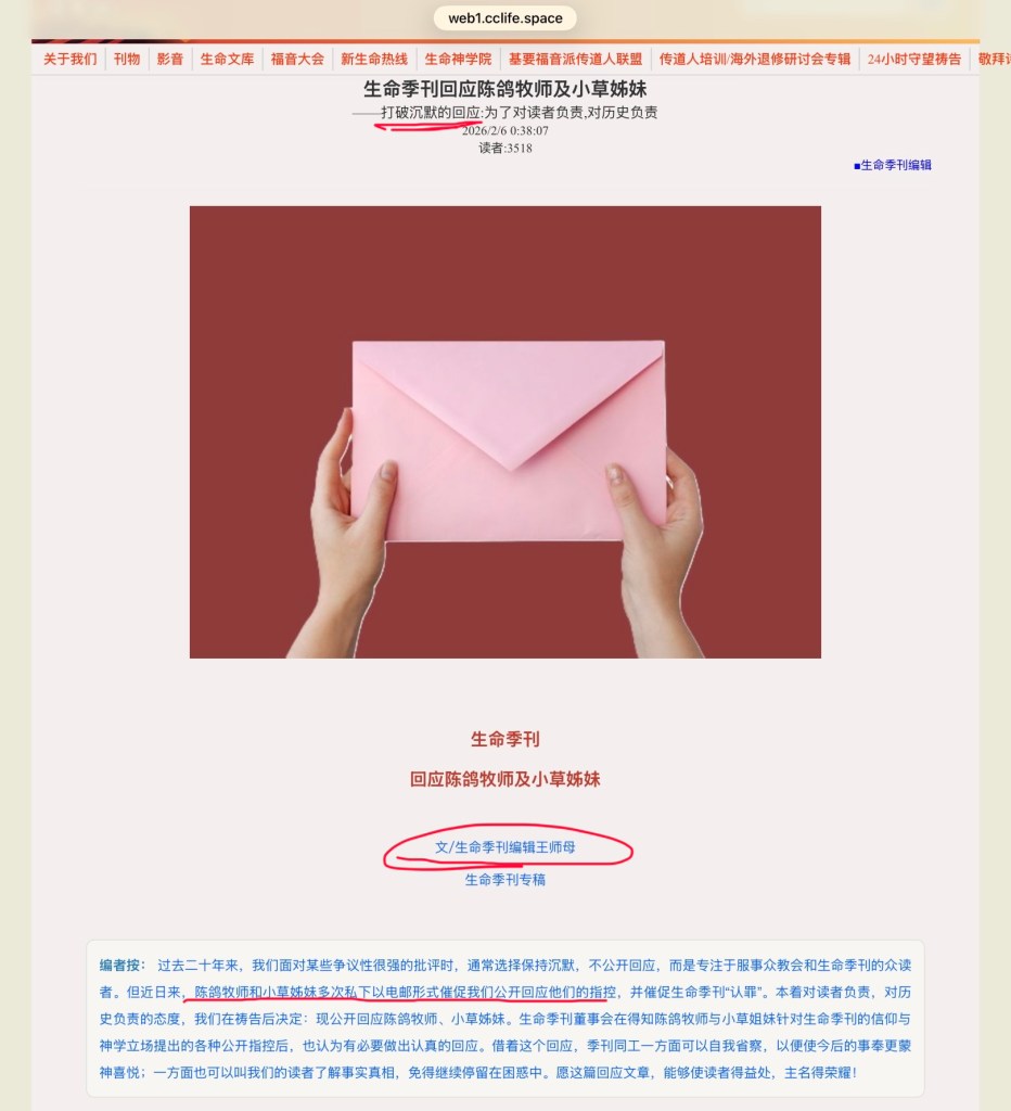 昨天我看到了生命季刊编辑屈儆聆在季刊网站上发表的《生命季刊回应陈鸽牧师及小草姊妹