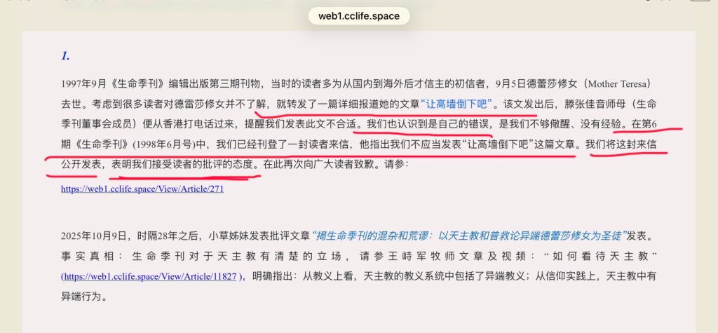 季刊在回应有关发表德蕾莎是得救的圣徒一文时说,“我们也认识到是自己的错误,是我们不够儆醒、没有经验。在第6期《生命季刊》(1998年6月号)中,我们已经刊登了一封读者来信,他指出我们不应当发表“让高墙倒下吧”这篇文章。我们将这封来信公开发表,表明我们接受读者的批评的态度。” 截图如下: