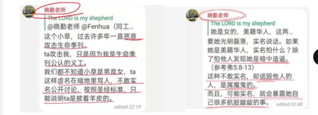 如果屈儆聆真的把我当基督徒姊妹,那就请她为辱骂我为疯狗而公开认罪道歉。疯狗和基督徒的身份是彻底不相容的,她究竟把我当作哪个?如果她真的把我当基督徒姊妹,那就请她让季刊的同工周晓勤为说我是属鬼魔的公开认罪道歉,否则就别假惺惺地称我为“姊妹”!属基督的就是神的儿女,辱骂神的儿女是疯狗,是属鬼魔的,这不只是得罪我,而是得罪神!下面是周晓勤辱骂我的话截图: