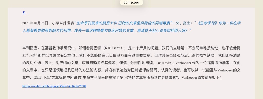 2021年10月26日,小草姊妹发表“生命季刊发表的赞赏卡尔.巴特的文章里所隐含的异端毒素”一文。指出:“《生命季刊》作为一份在华人基督教界颇有影响力的刊物,发表一篇这种赞誉和肯定巴特的文章,难道就不担心误导和拌倒人吗?”