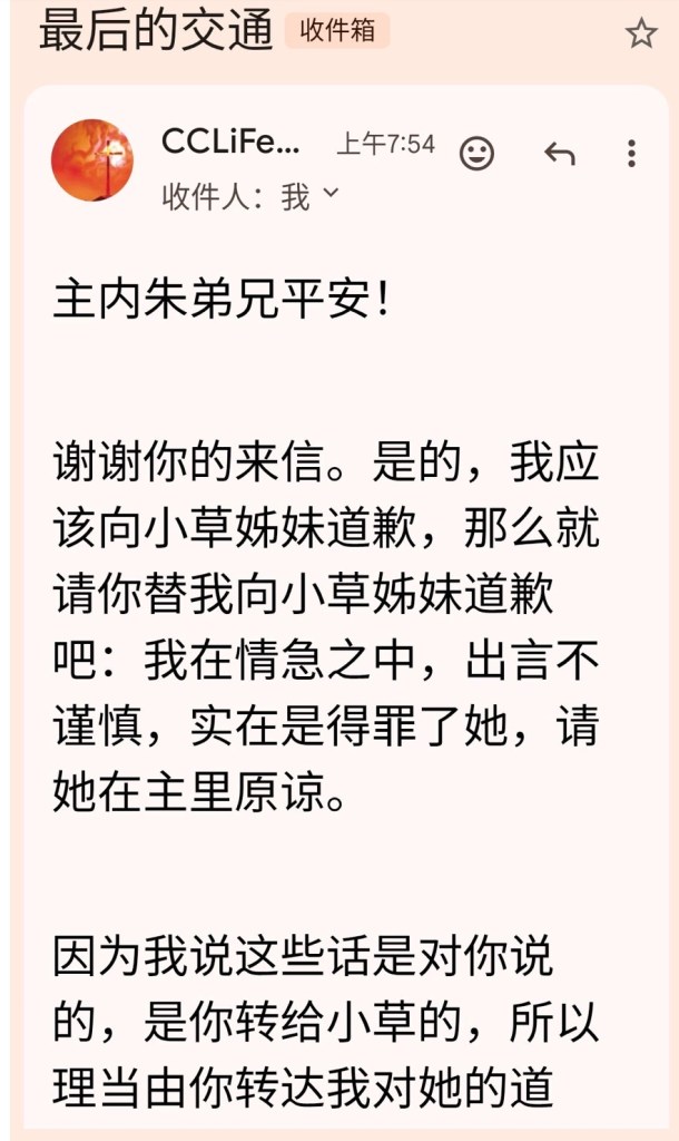 收到朱弟兄转来的你的“道歉”。你竟然连个“道歉”都要别人来转,我是感觉不到你的一点点诚意,而是觉得你一直在为你自己的种种过犯和罪恶找借口。