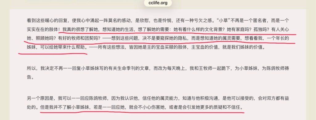 “ 。。。“小草”不再是一个匿名者,而是一个实实在在的肢体!我真的很想了解她,想知道她的生活,想了解她的需要:她有着什么样的文化背景?她有家庭吗?孤独吗?有人关心她、照顾她吗?有好的牧师和团契吗?——想到这些问题,决不是要窥探她的隐私,而是想知道她的属灵需要,想看看我,一个年长的姊妹,可以给她带来什么帮助。——所有这些想法,皆因她是主的宝血买赎的肢体,主宝血的价值,就是我们姊妹的价值。所以,我决定不再一一回复小草姊妹写的有关生命季刊的文章,而改为每天晚上,我和王牧师一起跪下,为小草姊妹,为陈鸽牧师祷告。另一个原因是,我可以一一回应陈鸽牧师,因为我认识他,信任他的属灵能力,知道与他积极沟通,是他可以接受的,会对双方都有益处的。但是我并不了解小草姊妹,若是一一回应她,就会不小心伤害她,或者是会引发她更多的质疑和不信任。 ” 原文字截图如下: