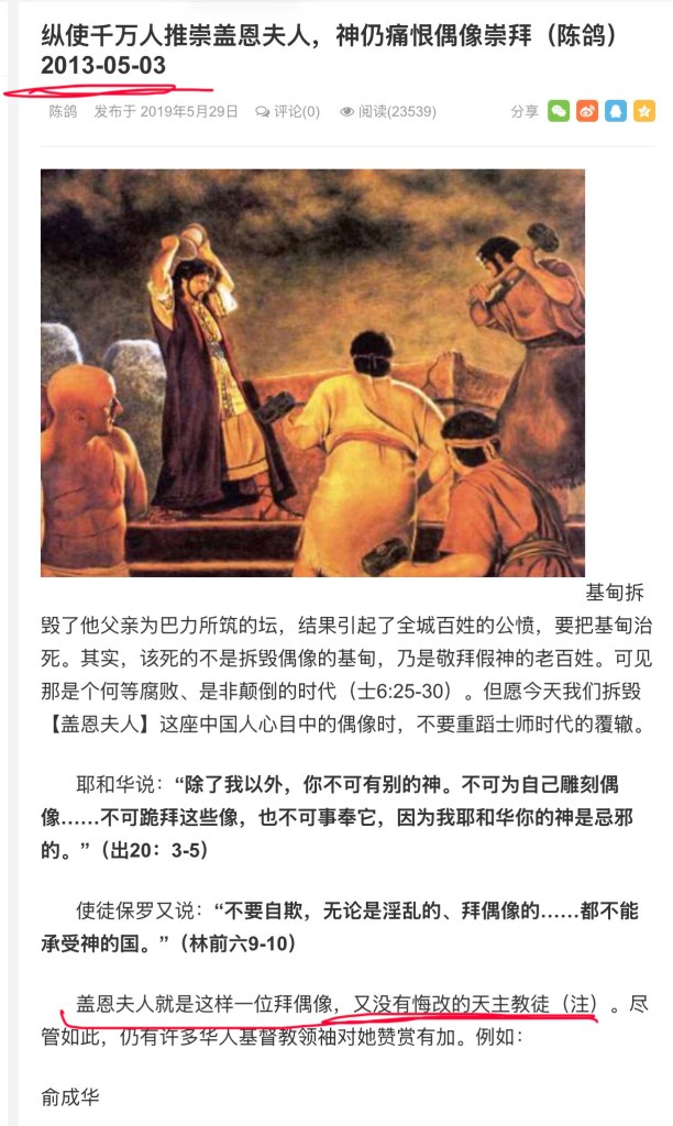 不过,我这篇文章旨在指出季刊也是推崇盖恩夫人的。2013年陈鸽就发表了《纵使千万人推崇盖恩夫人,神仍痛恨偶像崇拜(陈鸽)2013-05-03》一文,见下面截图: