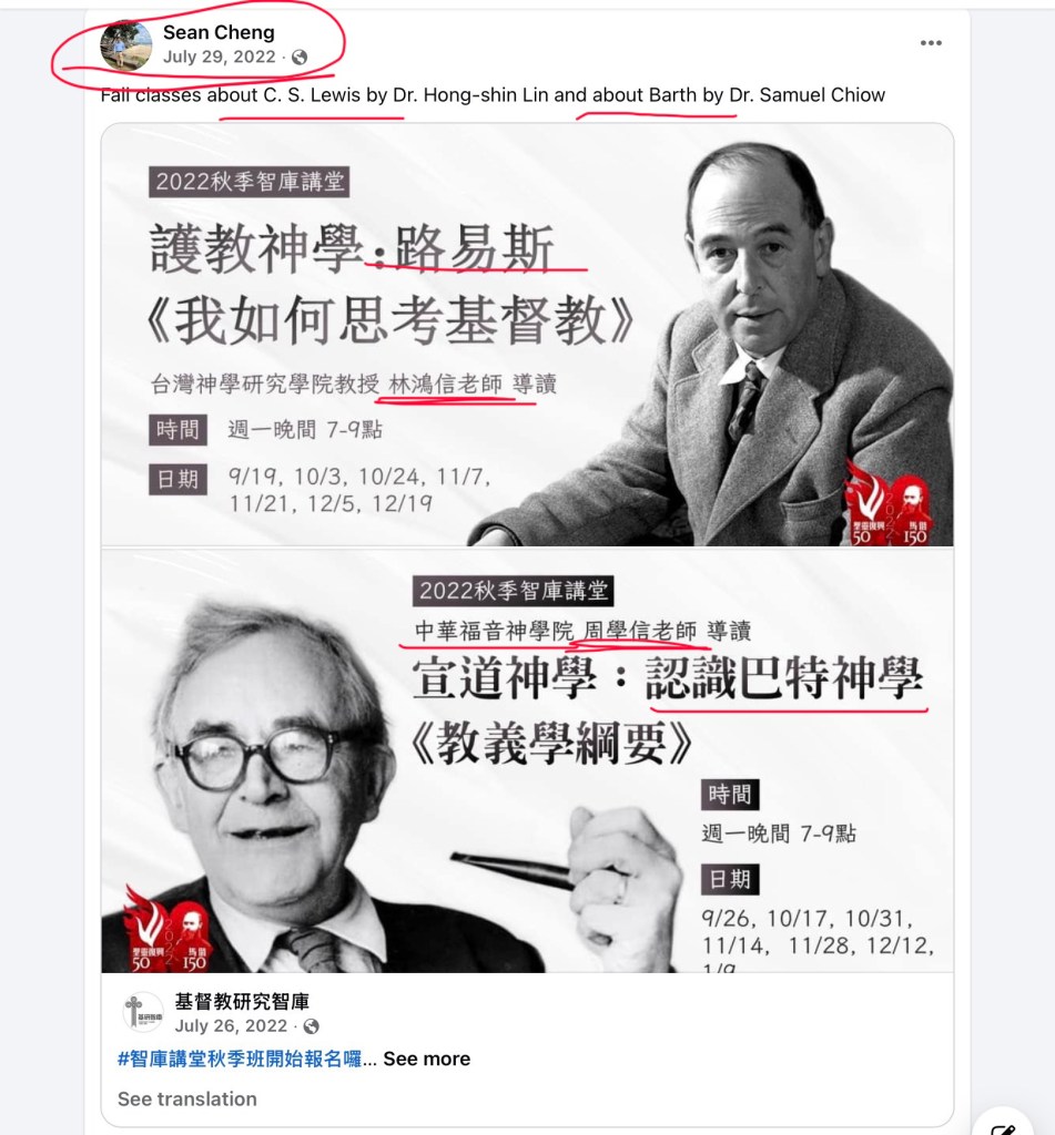 2024年程松(Sean Cheng)还在FB上打广告,自荐能帮助教会做基础护教培训。看下面截图: